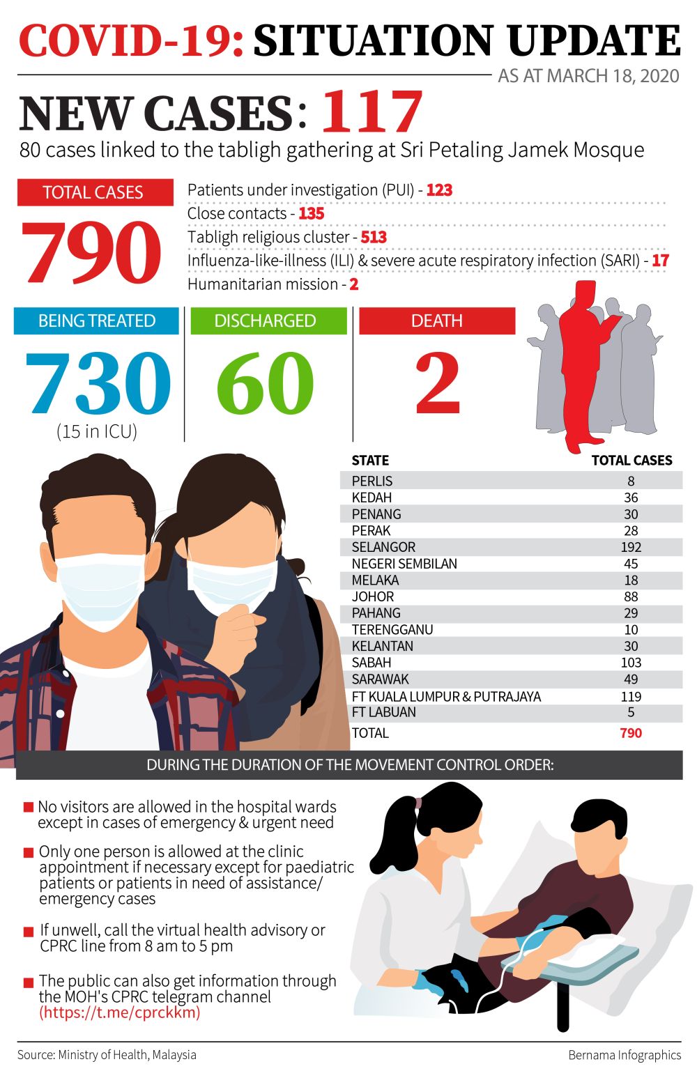 Based on the latest figures announced yesterday by Health Minister Datuk Seri Dr Adham Baba, Malaysia currently has a total cumulative tally of 790 confirmed Covid-19 cases, including 60 who have fully recovered and been discharged as well as two deaths.