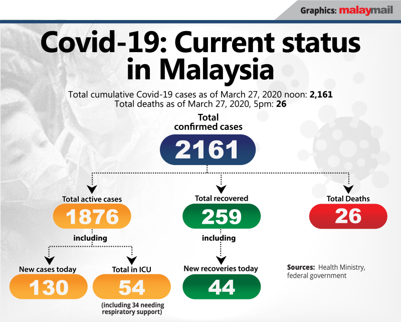 KUALA LUMPUR, March 27 — Health Director-General Datuk Dr Noor Hisham Abdullah announced 130 new positive Covid-19 cases today, bringing the total number of cases to 2,161.