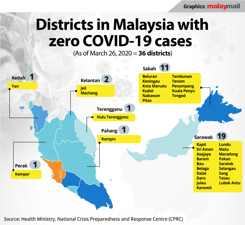 In the March 25 figures, there were a total of 39 districts spread out over seven states in Malaysia that still had not recorded any Covid-19 cases, with the bulk of these districts being in Sabah (11 districts) and Sarawak (19 districts).