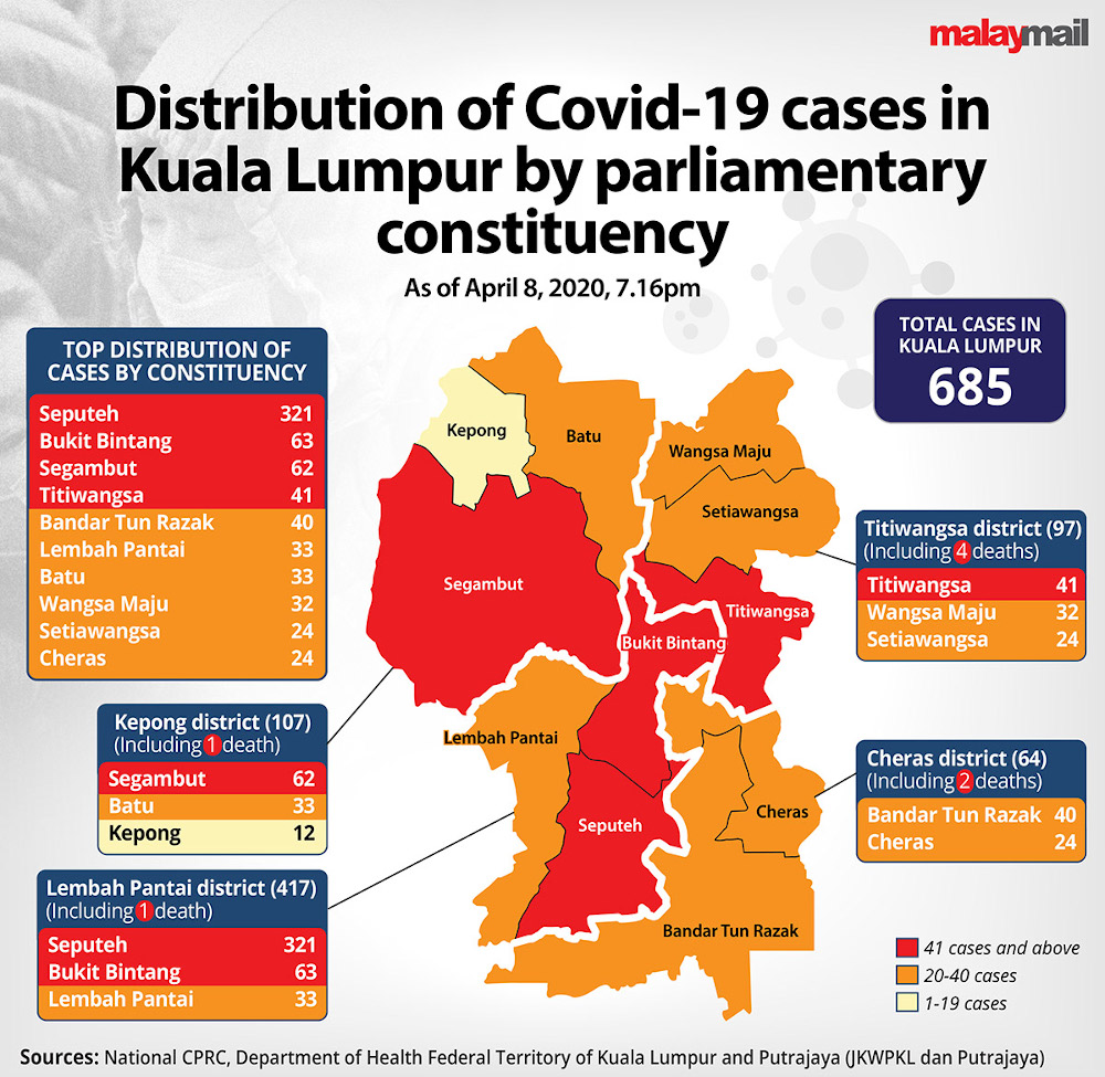 So as of April 8, the biggest contributor of Covid-19 cases in the Lembah Pantai district is actually Seputeh (321 cases), followed by Bukit Bintang (63) and Lembah Pantai (33), while the Covid-19 cases in Kepong district are mostly located in Segambut (62), then Batu (33) and Kepong (12).