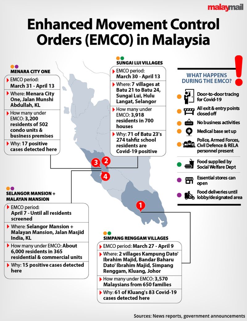 For example, four enhanced movement control orders (EMCO) are now imposed in selected villages and buildings where a high concentration of Covid-19 cases have been detected, with no residents allowed to leave and non-residents barred from entry as the Health Ministry carries out door-to-door checks to actively detect Covid-19 infections.