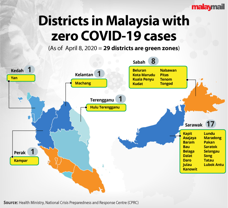 In a matter of about two weeks, the number of green zones in Malaysia has currently fallen to just 29 districts in six states as of April 6. The figure has remained unchanged on April 7 and April 8.