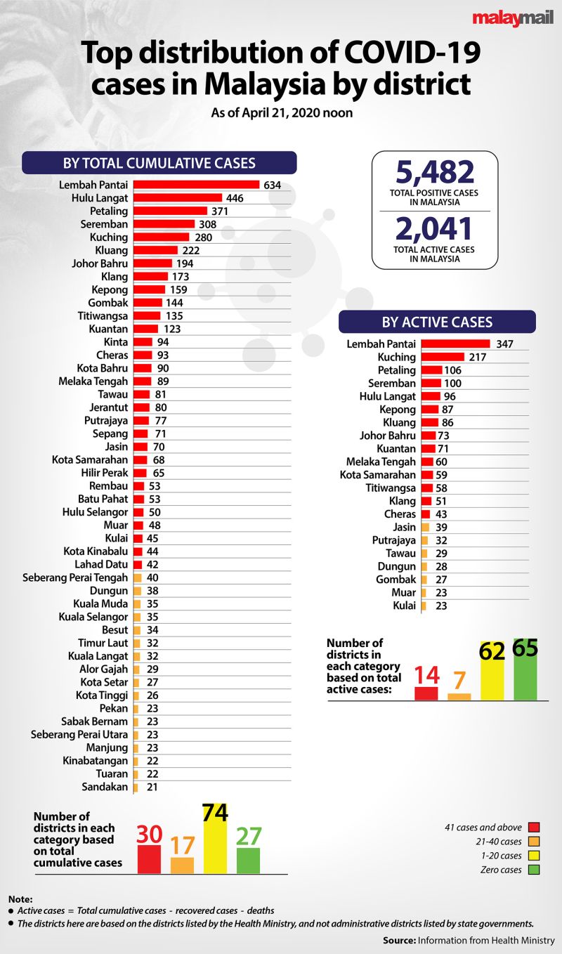 This is due to the number of active cases in these districts dropping to zero on April 21, down from the initial number of active cases recorded on April 20 (Manjung — three, Tambunan — two, Jempol, Bera, Cameron Highlands, Temerloh, Rompin, Pasir Mas — one each).