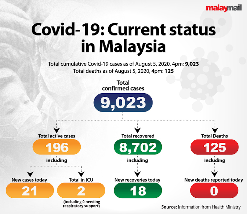 KUALA LUMPUR, August 5 — Malaysia reported 21 new Covid-19 cases today, a jump from just one case yesterday.