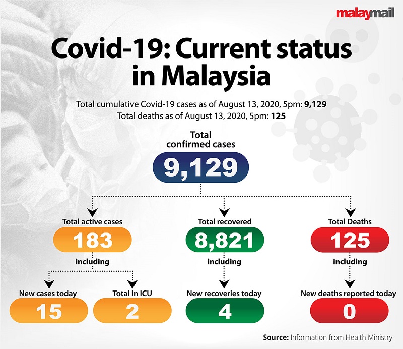 PUTRAJAYA, Aug 13 — Malaysia saw 15 new Covid-19 cases over the past 24 hours, nine of which were from a new cluster detected in Tawar, Kedah.