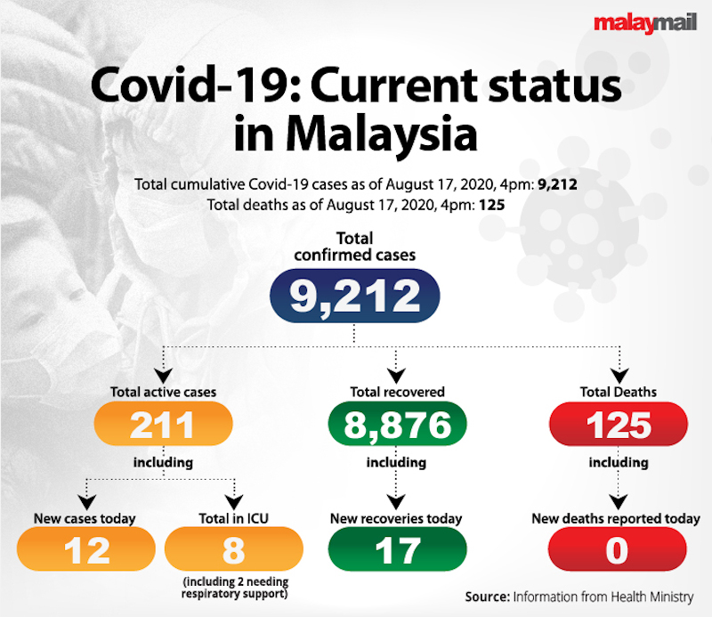 KUALA LUMPUR, Aug 17 — Malaysia today has 12 additional confirmed cases of Covid-19 including some belonging to the Tawar and Sala clusters, while a total of 17 recoveries were recorded today, the Health Ministry said.