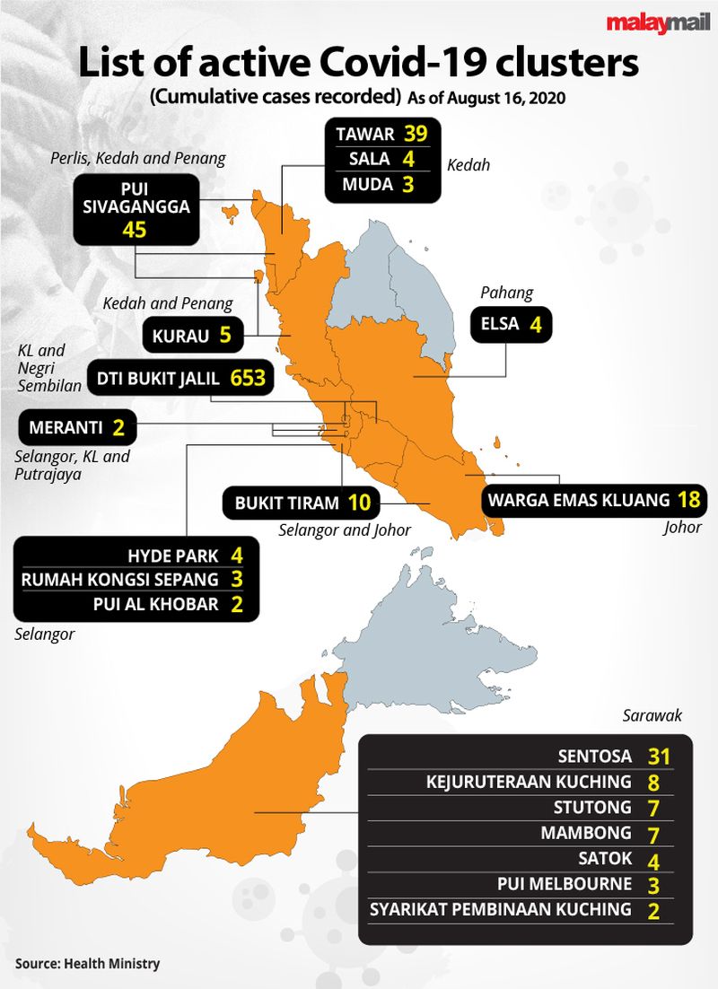 As of August 16, there were 20 Covid-19 clusters in Malaysia, with eight still registering active cases, according to data provided by the Health Ministry.
