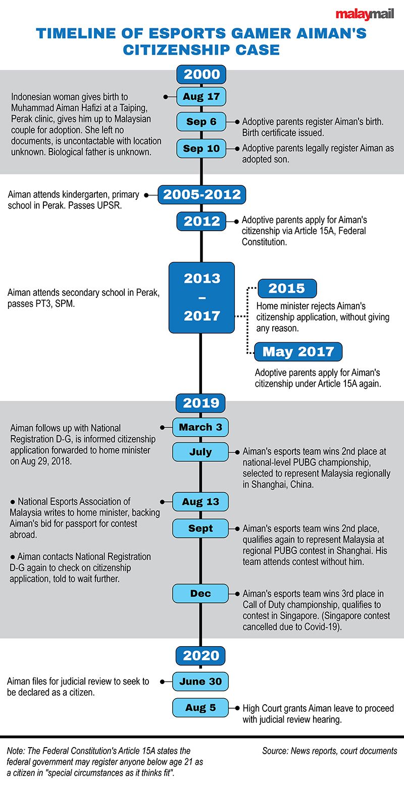 KUALA LUMPUR, Sept 2 ― Esports gamer Muhammad Aiman Hafizi Ahmad finally received official recognition as a Malaysian citizen yesterday, days after turning 20 and just a day after the Merdeka celebrations.