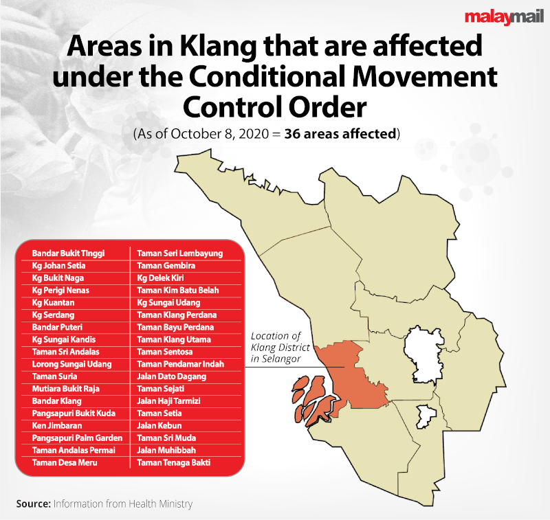KUALA LUMPUR, Oct 8 — Selangor Mentri Besar Datuk Seri Amirudin Shari has finally provided a list of the 36 areas in the Klang “mukim” (sub-district or parish) that will be placed under a conditional movement control order (CMCO) to contain Covid-19.