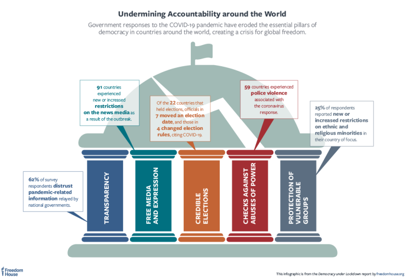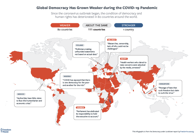United States-based human rights watchdog Freedom House reported that in such countries, out of the 192 surveyed, governments have responded to the pandemic by abusing their power, silencing their critics, and weakening or abolishing important institutions.