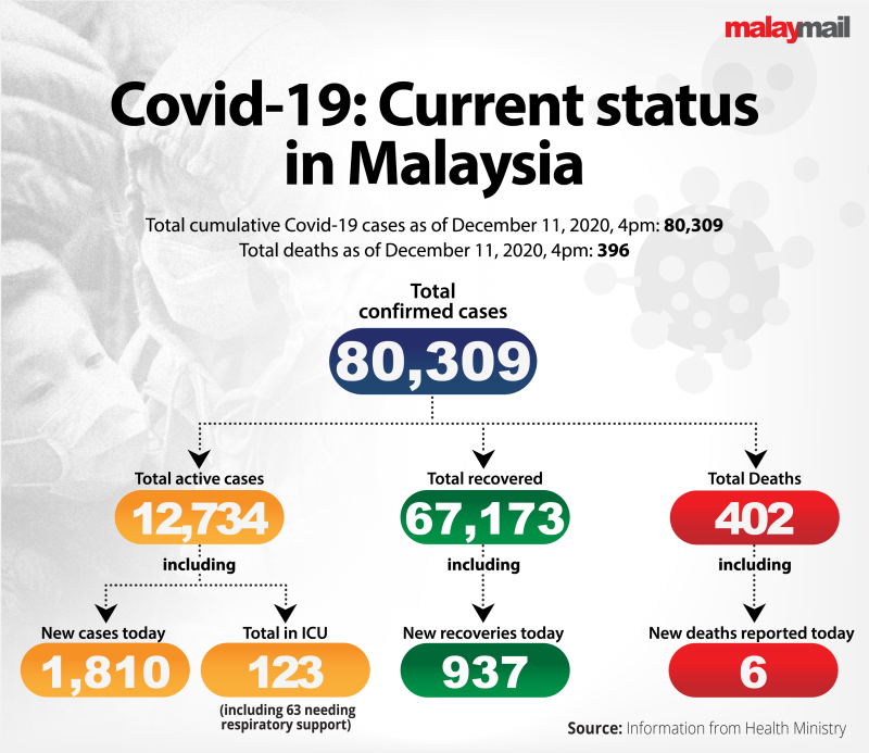 KUALA LUMPUR, Dec 11 — The Health Ministry today recorded 1,810 new Covid-19 cases, a slight drop from yesterday’s record-breaking 2,234 cases.