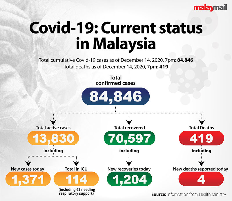 KUALA LUMPUR, Dec 14 — Malaysia recorded 1,371 new Covid-19 cases today, as the total number of infections in the country swells to 84,846 cases.