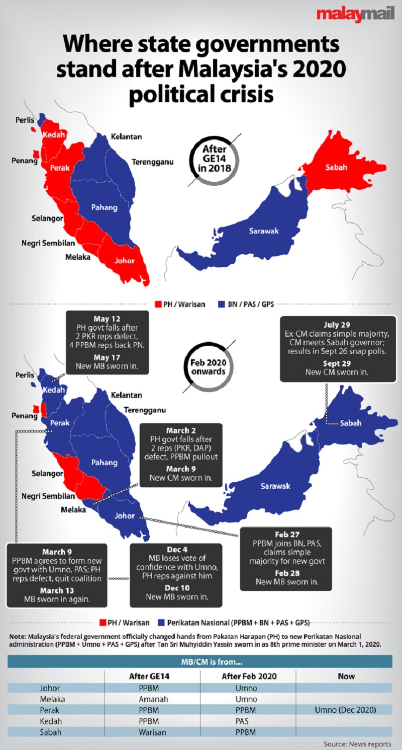 Read here for a full recap of how Pakatan Harapan lost three state governments (Johor, Melaka, Perak) within two weeks from late February to early March with the turn of political tide, before going on to lose Kedah about two months later. Following much drama in Sabah politics and an early state election in September, the state too fell to PN and its allies.
