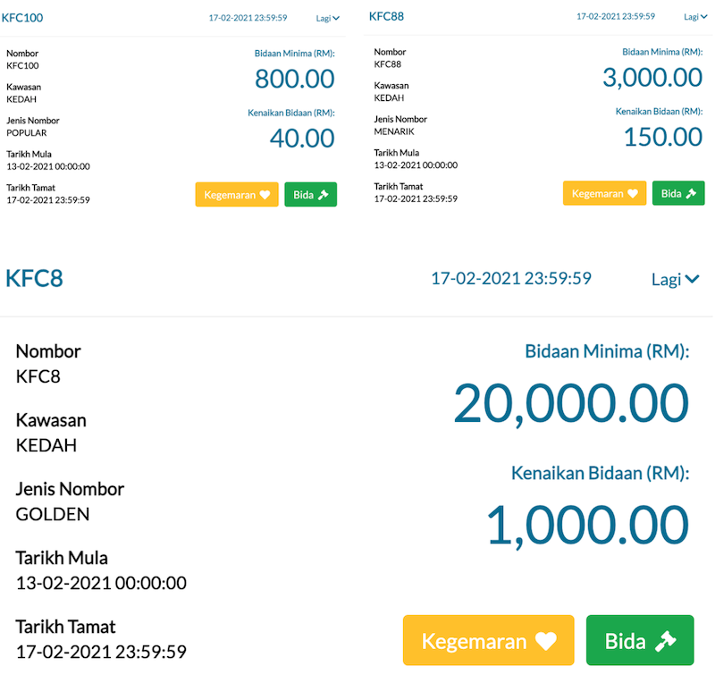 KUALA LUMPUR, Feb 16 — All you fried chicken fans can get in on the bids for KFC car registration plates by 11.59pm 17 February 2021. Some of the more sought-after KFC plates have a minimum bid of RM20,000.