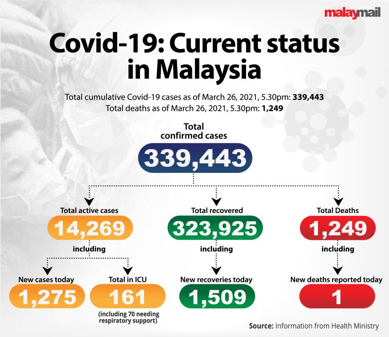 KUALA LUMPUR, March 26 — The Health Ministry announced 1,275 new Covid-19 infections and one death in the last 24-hour period.