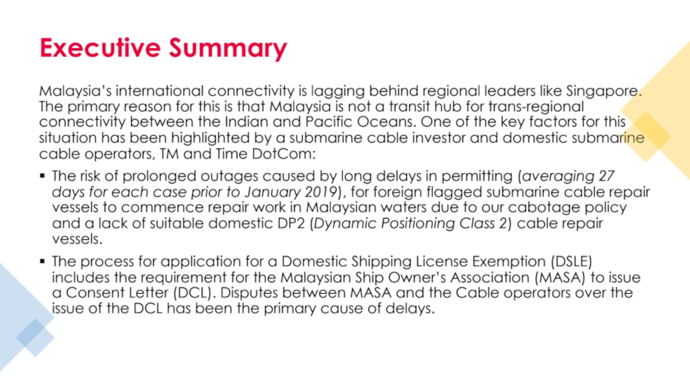 To recap, the cabotage exemption for foreign vessels to conduct undersea cable repairs was introduced by Anthony Loke in April 2019 after it was requested by Telekom Malaysia and Time dotCom in November 2018. The move was also supported by the Ministry of Communications and Multimedia which was led by Gobind Singh.