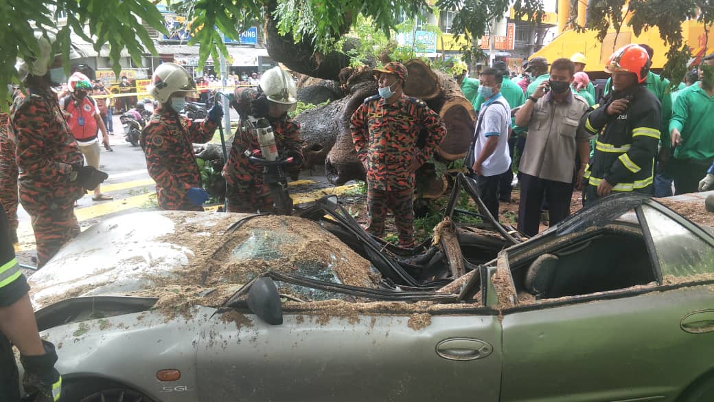 The Fire and Rescue Department with the help of MBPP, the Civil Defence Department and the voluntary fire brigade took almost two hours to cut through the branches to extricate Yong’s body trapped in the crushed car at about 11.15am.