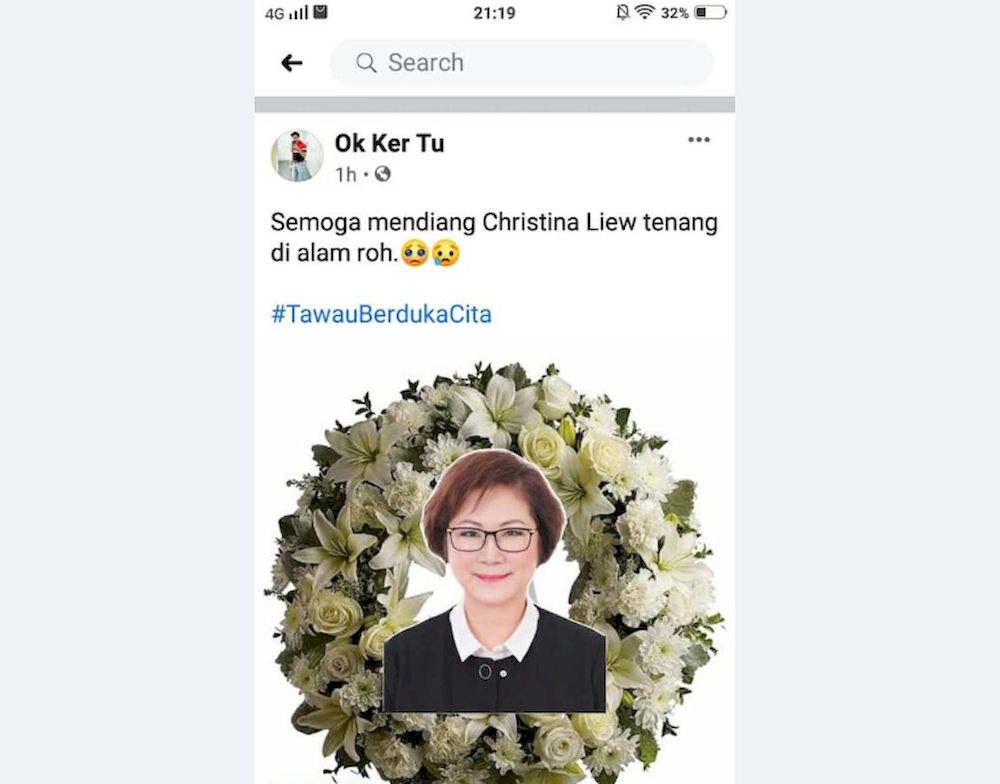 Liew said the posting on Facebook was a message of condolence along with her photo and a wreath to suggest her passing, was in bad taste and hitting a new low.