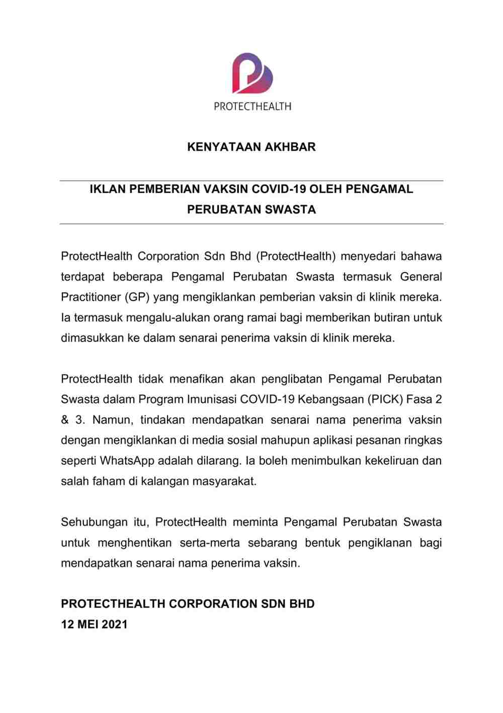 KUALA LUMPUR, May 13 ― ProtectHealth, an incorporated entity appointed by the Ministry of Health to manage Private Medical Practitioners participation in the Covid-19 vaccination programme has issued a statement urging all private clinics and hospitals to stop advertising that they are offering vaccinations at their clinic.