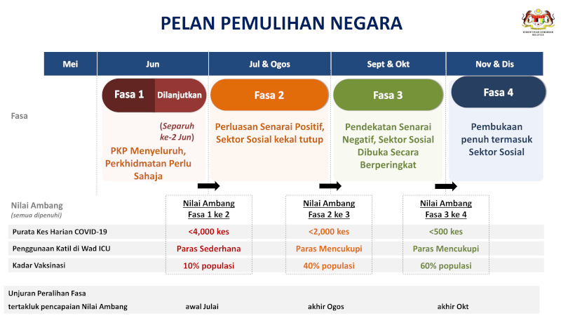 He said in order to reach Phase Four where sports and social events are allowed, among others new Covid-19 cases need to drop below 500 and 60 per cent of the country’s population have received two doses of vaccine.