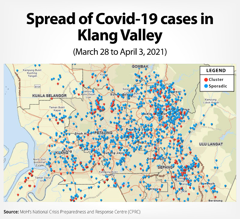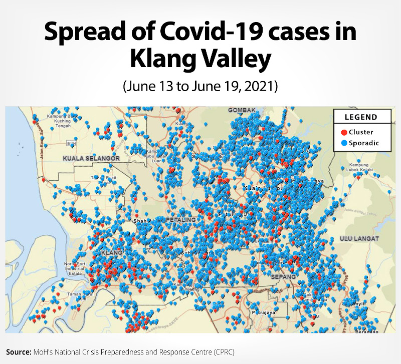 From June 13 to 19, Klang Valley recorded the highest number of sporadic cases in a week in Malaysia. The three districts which accounted for the highest number of sporadic cases were Petaling (3,905 cases), Hulu Langat (2,783 cases) and Klang (2,482 cases).