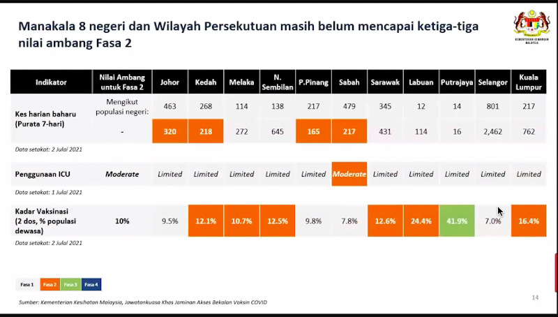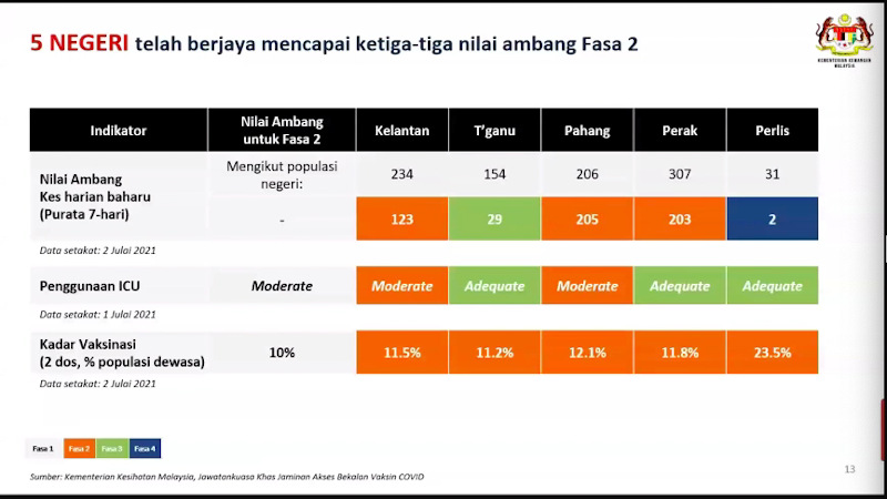 A slide presented during a virtual press conference showed Perlis with the lowest seven-day case average of two cases and 0.8 cases per 100,000 people which actually is sufficient to move into Phase 4 of the NRP that allows almost all economic activities and sectors to operate.