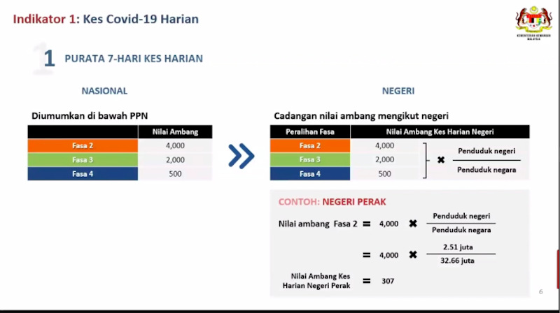 For example, Perak with a population 2.51 million requires their daily case average to drop below 307 cases to transition into Phase 2, a figure obtained after calculating 4000 x (2.51 million/32.66 million).