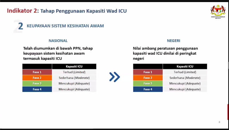 The finance minister said these statewide thresholds were similar to the four-phase benchmarks under the National Recovery Plan (NRP), just scaled down to reflect the population of each state, their daily average number of new Covid-19 cases, their respective hospital Intensive Care Unit (ICU) capacity and their respective vaccination rate.