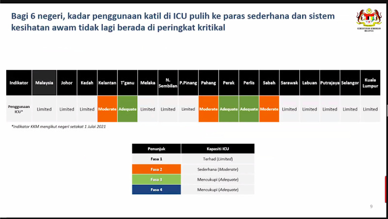 Currently all states except the five allowed to transition into Phase 2 have reported limited space in their respective ICU. Perak, Perlis and Terengganu report an “adequate” load on their units, while ICUs in Kelantan, Pahang and Sabah are currently at a “moderate” load.