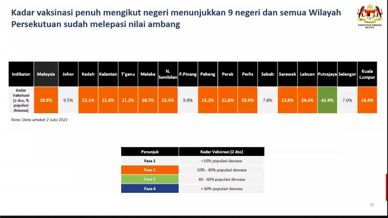 Statistics provided during the press conference showed Putrajaya as the Federal Territory with the highest vaccination rate with 41.9 per cent of the population already with their second dose, followed by Labuan with 24.4 per cent fully vaccinated and Perlis with 23.5 per cent.