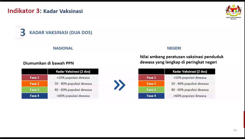 The vaccination rates required in states to transition to the next NRP Phase, said Tengku Zafrul, also mirror the national requirements, with more than 10 per cent of the population required to have received their second vaccine dose to enter Phase 2, more than 40 per cent vaccinated to enter Phase 3, and more than 60 per cent vaccinated to enter Phase 4.