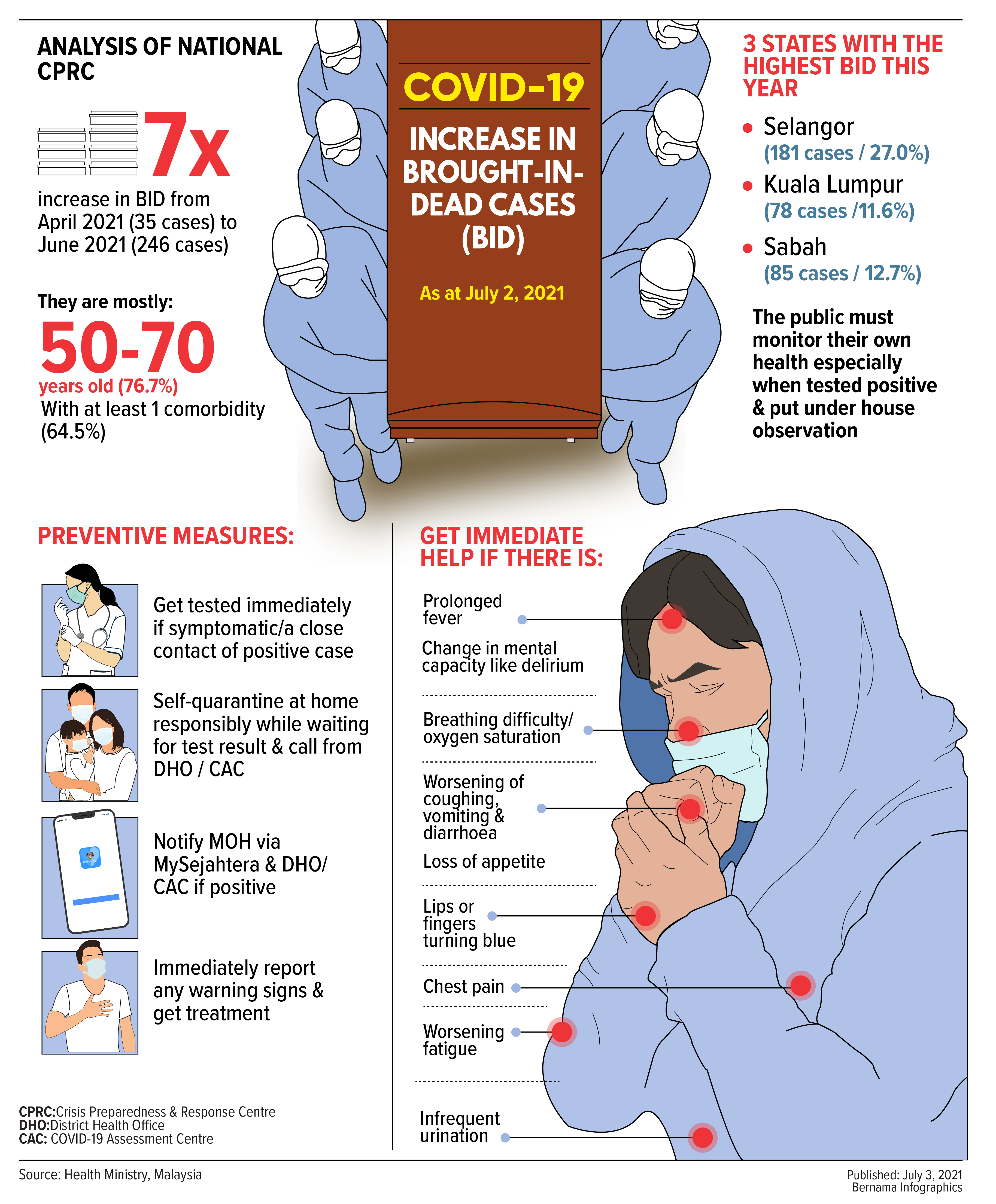 KUALA LUMPUR, July 3 — Covid-19 patients undergoing home quarantine must monitor for several symptoms that could precede a rapid and potentially deadly deterioration, the Health Ministry said today.