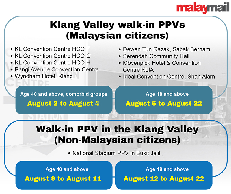 However, CITF explained that walk-in vaccinations from August 2 to 4 will be for Malaysians aged 40 and above or those with comorbidities, while all Malaysians aged 18 and above in the Klang Valley can walk in from August 5 to 22.