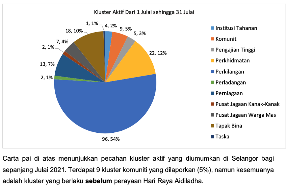 According to a document shared by the Selangor Health Department, from July 1 until 31, the manufacturing sector recorded 96 active clusters, contributing a total of 54 per cent of the overall clusters in Selangor.