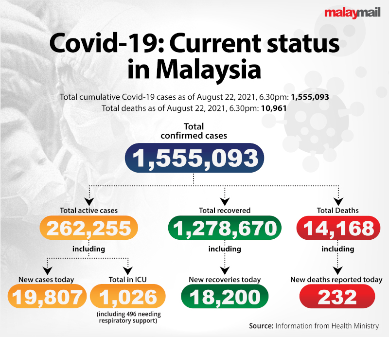 KUALA LUMPUR, Aug 22 — Malaysia recorded a dip in Covid-19 cases with 19,807 new infections reported in the past 24 hours.