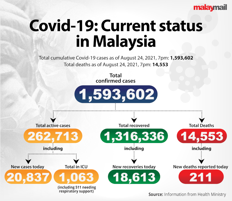 KUALA LUMPUR, Aug 24 — Malaysia’s declining daily Covid-19 cases saw a reversal today as the Health Ministry logged 20,837 in the past 24 hours.