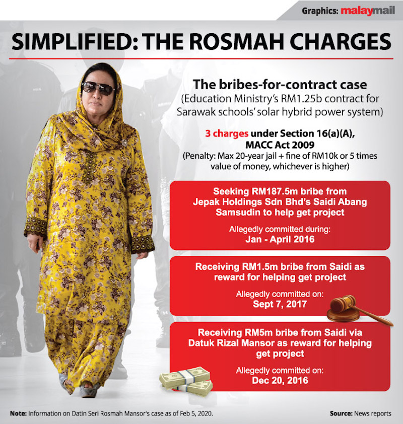 She is also charged with soliciting RM187.5 million from Saidi in 2016 and 2017 for the Sarawak schools solar energy supply project, as well as receiving RM6.5 million in cash from him.