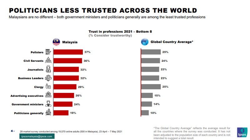 Ipsos found the Malaysian perception of its politicians being the least trustworthy profession shared by their counterparts around the world, holding a measly 10 per cent trustworthiness rating, followed by ministers with 14 per cent and advertising executives with 15 per cent.
