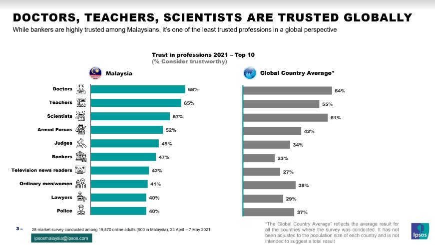 The survey, titled Trust in Professions by market analysts Ipsos shared that doctors hold the top spot for the most trusted professions, with 68 per cent of Malaysians considering them trustworthy, followed by teachers (65 per cent), scientists (57 per cent), armed forces (52 per cent) and judges (49 per cent).