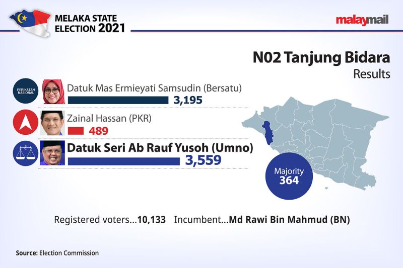 According to the EC, BN’s Datuk Seri Ab Rauf Yusoh trumped PN’s Datuk Mas Ermieyati Samsudin with a thin majority of 364 votes in the hot seat of Tanjung Bidara.