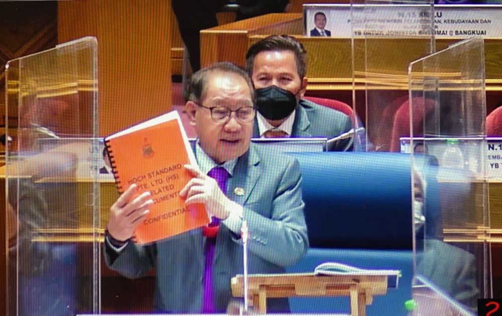 Kitingan then said, “There’s no contradiction here. That’s a question of timing. At the time, the AG had not yet received this,” he said, holding up a binder titled “Hoch Standard Pte Ltd related document — Confidential”.