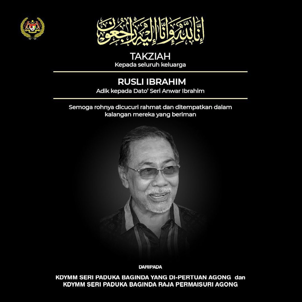 KUALA LUMPUR, March 1 ― The Yang di-Pertuan Agong, Al-Sultan Abdullah Ri’ayatuddin Al-Mustafa Billah Shah and the Raja Permaisuri Agong, Tunku Hajah Azizah Aminah Maimunah Iskandariah have expressed their condolences to the family of Rusli Ibrahim, the younger brother of opposition leader Anwar Ibrahim who passed away today.