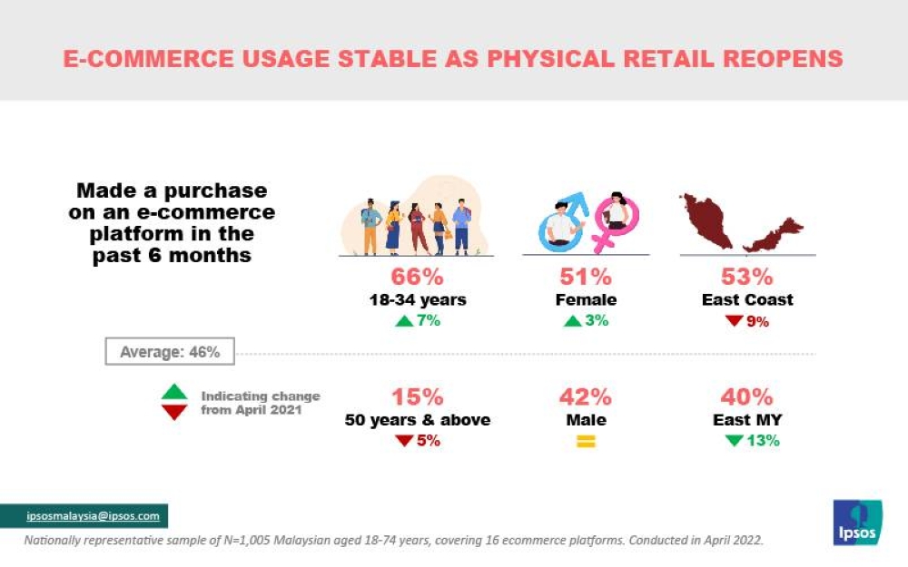 The Ipsos report also showed that states in the east coast of peninsular Malaysia have a higher share of e-commerce shoppers than any other region, but added that these regional differences are less distinct than in 2021.