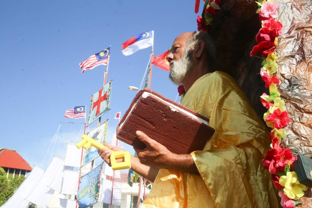 He was dressed in a robe holding in one hand a golden key — symbolising the key to heaven — and a Bible in the other, representing St Peter as part of the boat decoration contest.