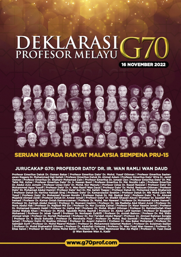 KUALA LUMPUR, Nov 16 — A group of 70 Malay professors and academics today published its criteria for the political coalition that should receive public support at the ballot this Saturday, including calling for the rejection of candidates who rely on slander and exploit ethnoreligious sentiments.