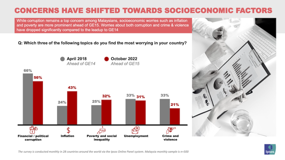 "Now, socioeconomic concerns are more evident – worry about inflation has almost doubled since GE14, and poverty and social inequality are on people’s minds more than it was before.