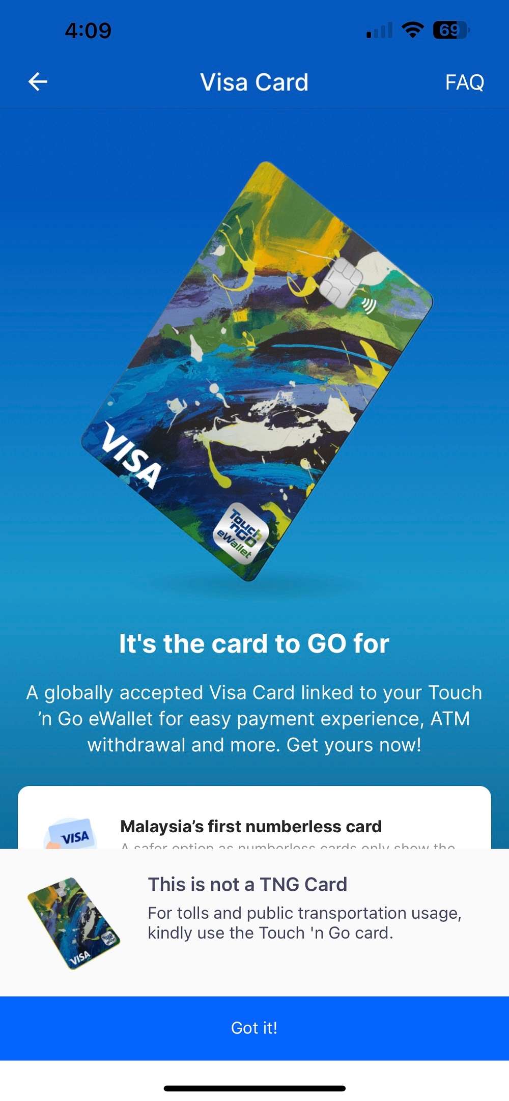We checked it out for ourselves, and indeed when you tap on the Visa logo in the eWallet app to apply for one of these cards, it will display the ‘This is not a TNG Card’ disclaimer at the bottom, with the additional line explaining that for tolls and public transportation usage, please use a regular TNG card instead.