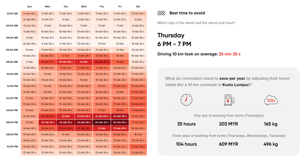 TomTom's data showed that the worst rush hour in the week in Kuala Lumpur would typically fall on Thursdays during the 6pm to 7pm slot, where it would take 25 minutes 20 seconds on average to drive 10km in the city centre area.