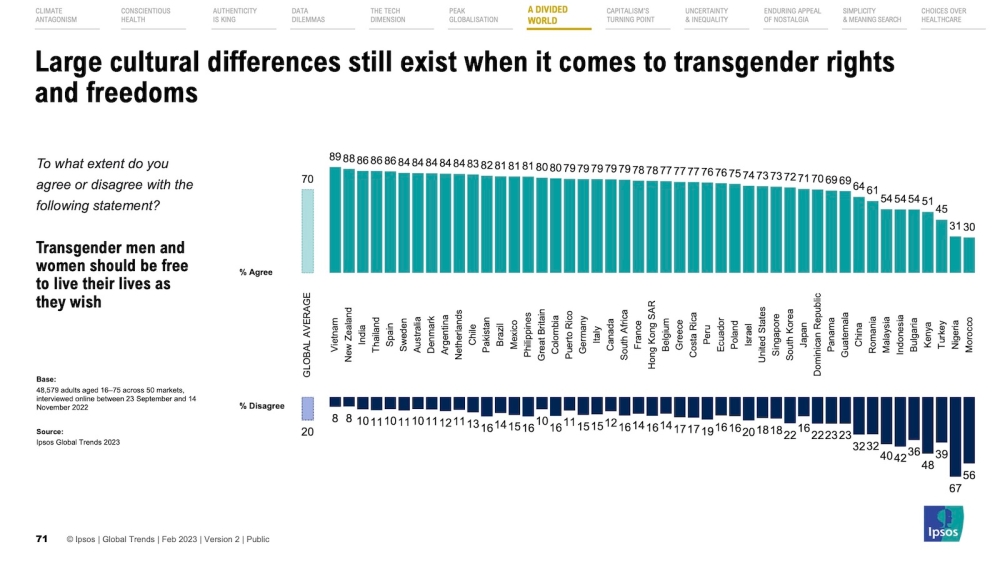 KUALA LUMPUR, March 2 — Over half of Malaysian respondents agreed that transgender individuals should be able to live their lives as they wished and without interference, according to a study by market research firm Ipsos.