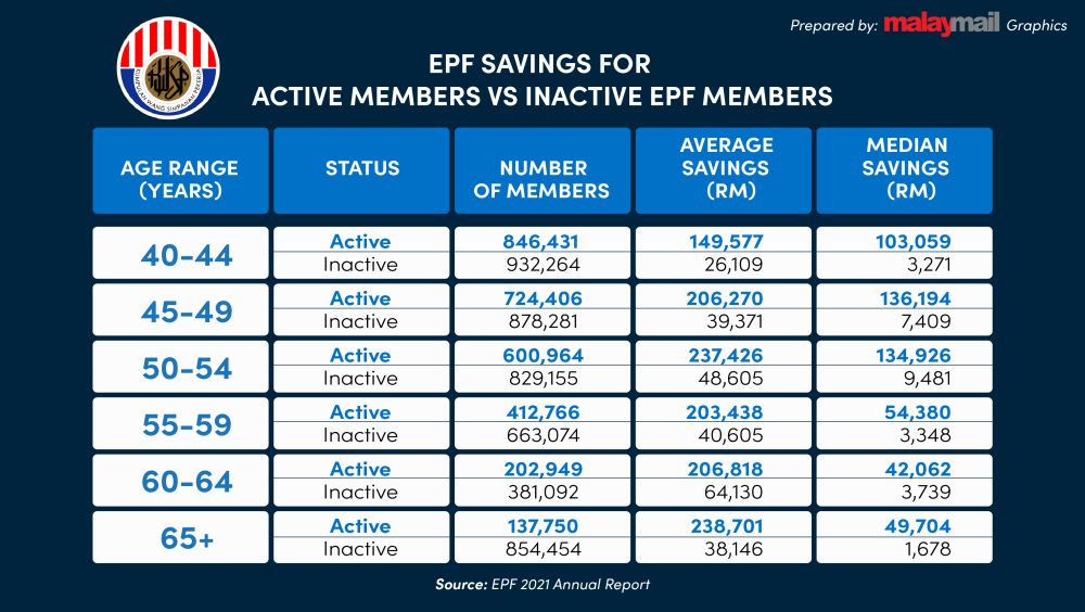 “The EPF places the highest importance on the integrity of member data and adheres to strict policies, controls, and audit procedures. This is in keeping with the EPF’s role as trustee and custodian of members’ retirement savings. “We would like to clarify that the table contained in the EPF 2021 Annual Report refers to active members only. As at end December 2022, there are actually 4.81 million EPF members in the 40-54 age range, with 2.17 million being active members and 2.64 million inactive members,” it said in a statement.